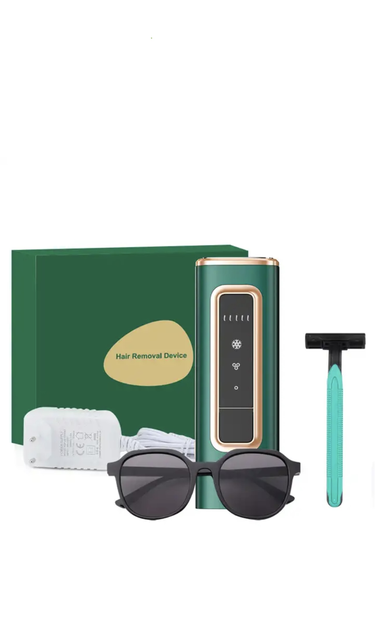 بسته بندی کامل شامل:آداپتور،عینک،ژیلت،دستگاه لیزر